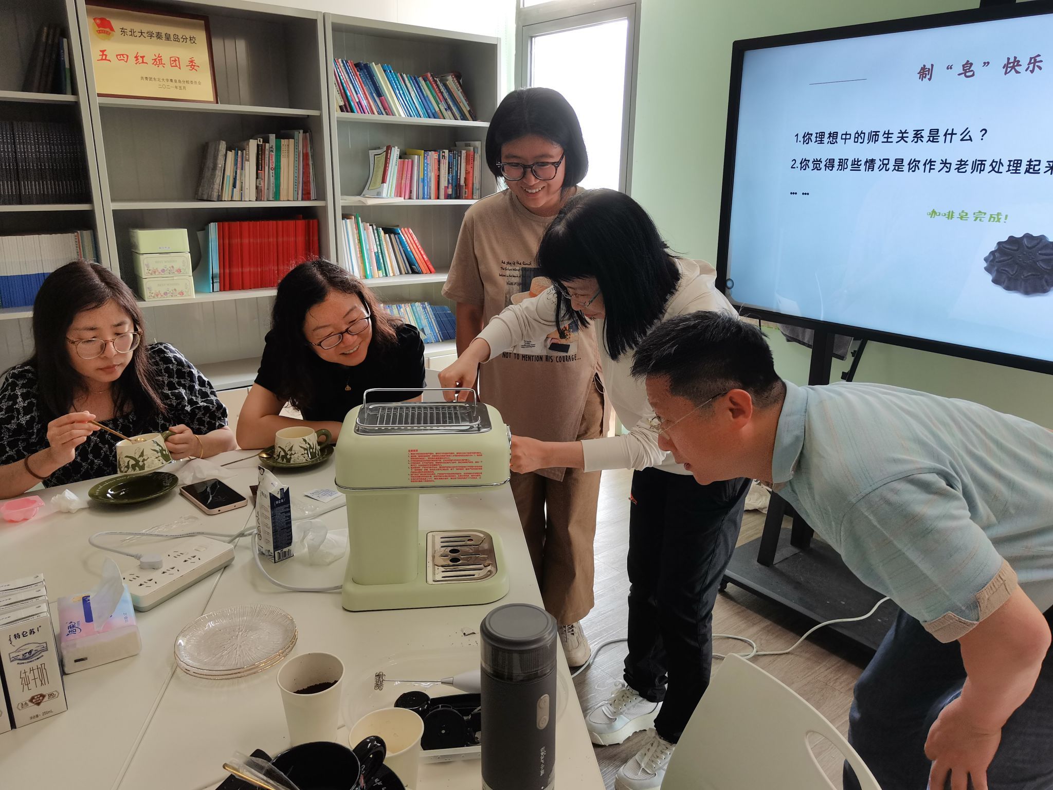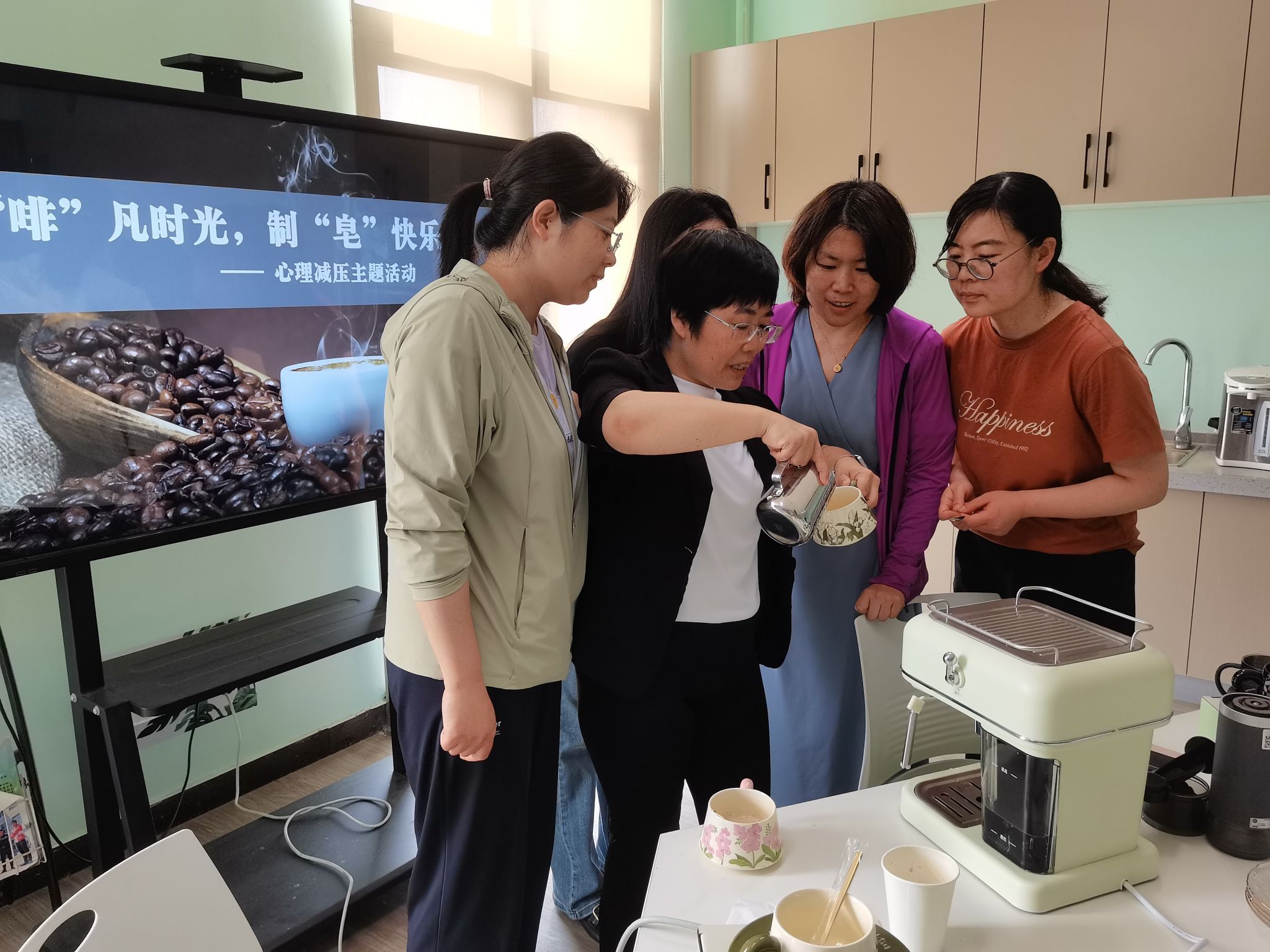 随后开启的“制‘皂’快乐” 环节,充分践行环保理念与创意融合。教职工将咖啡研磨后的废渣经微波炉烘干处理,巧妙搭配肥皂原材料与造型模具,亲手打造兼具去角质功能与咖啡清香的手工皂。从材料配比到模具塑形,每一步都凝结着创作者的巧思,现场欢声笑语不断,压力在指尖创意中悄然消解。